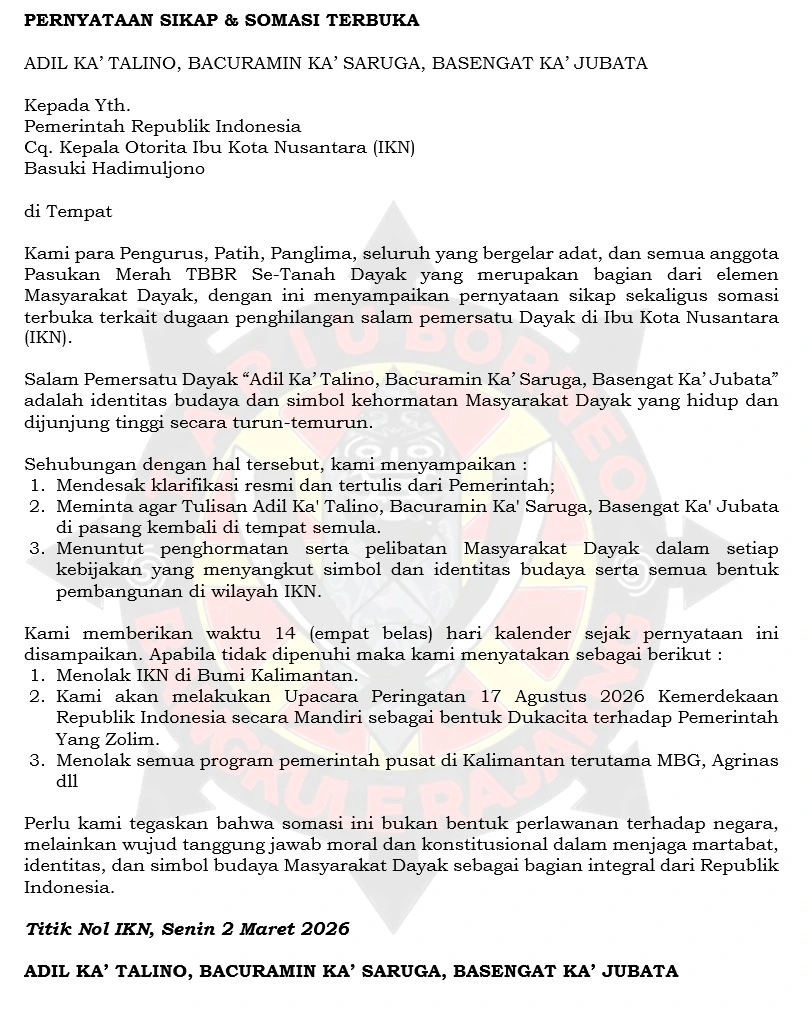 “Jika dalam waktu yang telah kami tentukan tidak ada kejelasan, maka kami akan mengambil langkah sikap lanjutan sebagai bentuk tanggung jawab moral dalam menjaga martabat budaya Dayak,” ujarnya.